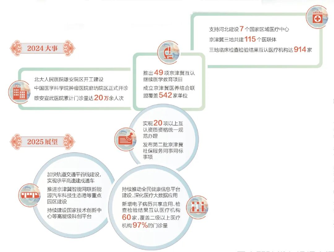 “按您上回说的,检查、化验都做好了,CT、核磁也拍了。”2月初,张家口患者王先生到北京积水潭医院骨肿瘤科主任医师鱼锋的诊室复诊。王先生今年60岁,因患骨肿瘤2023年在积水潭医院做了手术,主刀的是鱼锋。此后,他遵医嘱每3个月复查一次。“从走进诊室到离开医院,前后用时50分钟。当天下午坐高铁就到家了。”王先生说,“比想象中方便得多。”如此便捷,是因为京津冀检验检查结果已经互认。“过去复诊,外地患者得跑两趟北京。”鱼锋解释,挂号开单据、检查、等结果、再挂号复诊……一套流程下来,少则两三天,多则一礼拜。而检验检查结果互认的落地,不仅减少了重复检查造成的资源浪费,更缩短了就诊和等候的周期。北京市与天津市、河北省医疗机构检查检验结果互认范围还在持续扩大。河北省卫健委介绍,目前,京津冀914家医疗机构实现60项检验结果互认,686家医疗机构实现50项影像检查资料共享。“能够在保证质量的同时,为患者提供更加省时、省力、省钱的医疗服务,这是医护人员共同的心愿。”鱼锋说。春节假期,宣武医院河北医院副院长、宣武医院神经外科主任医师汤劼收到了石家庄患者赵女士发来的拜年微信,并附上了自己弹奏《我的祖国》的视频。几个月前,赵女士因突发抽搐被家人送到宣武医院河北医院。经检查,她脑部负责手功能的区域出现了病变,被确诊为胶质瘤。详细了解了患者情况,汤劼给出的手术方案是——施行前沿的“术中唤醒”治疗,这样可以保护相关功能,也能更精准地切除肿瘤。经过长达6个小时的缜密操作,手术顺利结束。两周后,赵女士平安出院了。“建立医联体以来,河北医院脑肿瘤治疗量增长了10倍都不止。”汤劼说,河北医院就有30多位北京医生,像他这样“两头跑”。以前当地做不了的手术,现在都能做了。该院只是一个缩影。今年1月,河北省宣布京津冀医联体由2023年底的40个增至115个,越来越多居民不出省就能看上名医。在北大人民医院心内科复诊后,石家庄患者王先生到人工服务窗口办理结算,不到3分钟就成功缴费。王先生的手机收到短信,详细列出费用明细。他感慨:“以前来北京看病,报销手续麻烦得很,现在直接结算,省心多了!”68岁的王先生确诊冠心病4年。因需定期复查心脏支架术后情况,他选择到北大人民医院复诊。“2022年,第一次来北京复诊,得提前到石家庄的医保局备案。就诊时自己先垫付检查费,回石家庄交材料,再等报销。折腾了一个多月,报销费用才到账。”他回忆。2023年4月,京津冀三地同时明确规定,三地参保人员在区域内定点医疗机构就诊时,持医保卡或电子凭证即可自动视同备案。此后,王先生就医流程简化了:“2024年开始,连手机备案都不用了,挂号时刷医保卡直接报销,和在本地看病没区别。”目前,津冀两地患者在北京市所有有床位的定点医疗机构住院,以及在3000余家定点医疗机构门诊就医,均可办理异地直接结算。北京市开通门诊慢特病异地直接结算的定点医疗机构达到2500余家。1400余家定点零售药店开通自主购药异地直接结算。京津冀医疗协同不断深入推进。更多像王先生这样的慢性病患者享受到“跨省同城”的便利。新进展